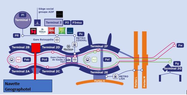 Pour faciliter votre transfert, la navette se prend au Terminal 2 de l’aéroport Roissy-Charles-de-Gaulle, exactement entre les terminaux 2B et 2D. Il vous suffit de suivre les panneaux “Terminal 2B/2D” puis “Bus” pour rejoindre aisément le point d’arrêt.